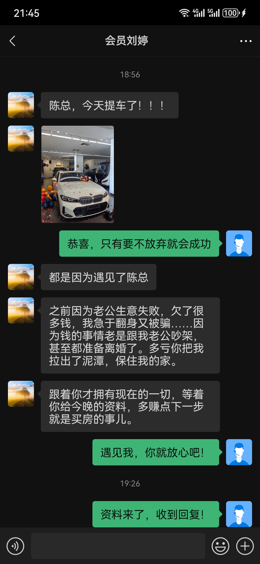 陈总你说你的资料怎么这么厉害咯,债务还了,车也买了,我要继续跟着你,然后在买两套房,那我的人生就完美了,哈哈哈哈哈,谢谢你啊,认识你真好。太高兴了。 |