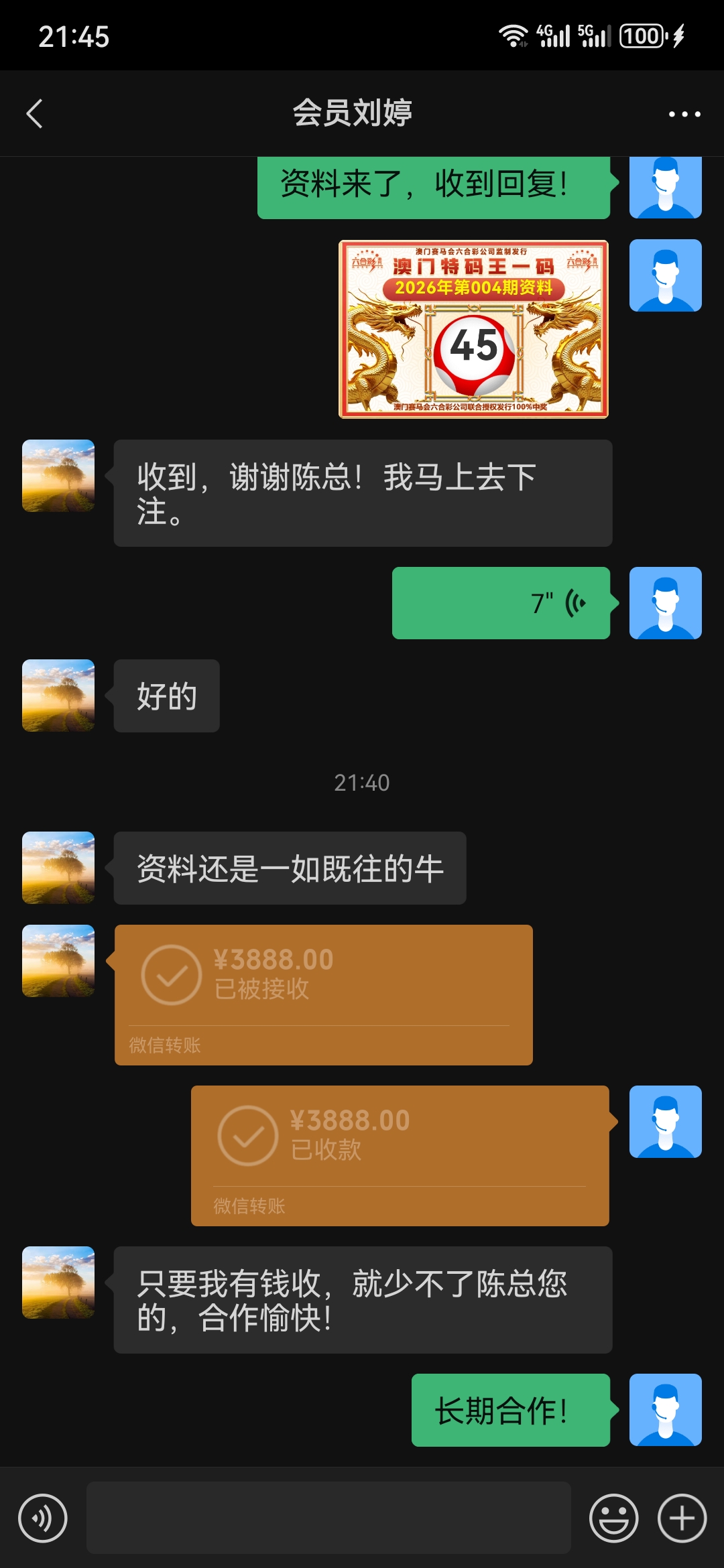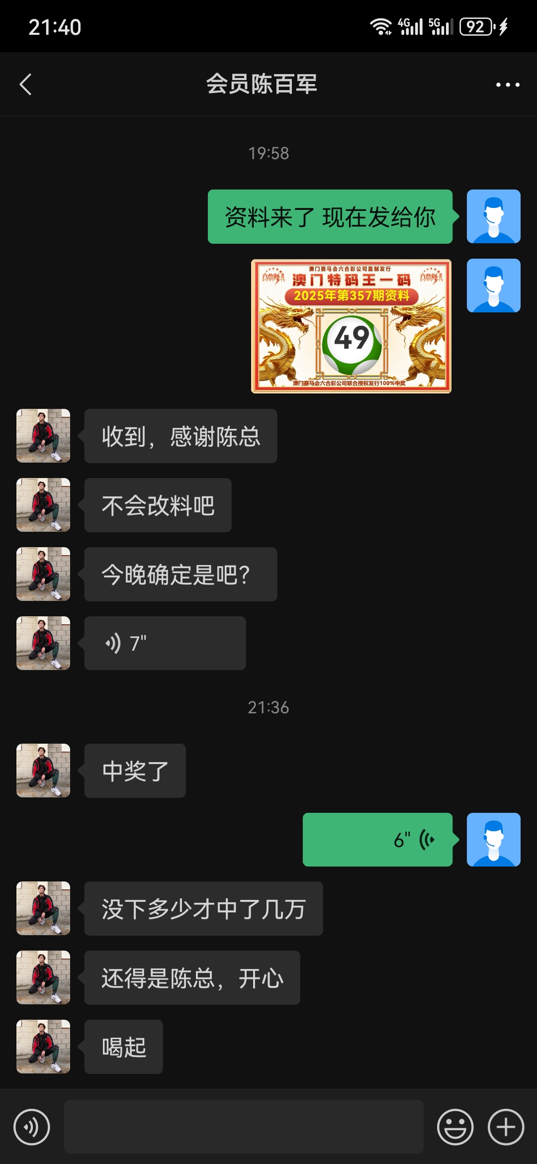 陈总真的是太谢谢您啦!最近的资料让我赢了不少!这么好的资料想不发财都难,合作有7期啦,我赚了一百来万了哦,我还给彭总转了5万块红包,祝身体健康,发大财! |