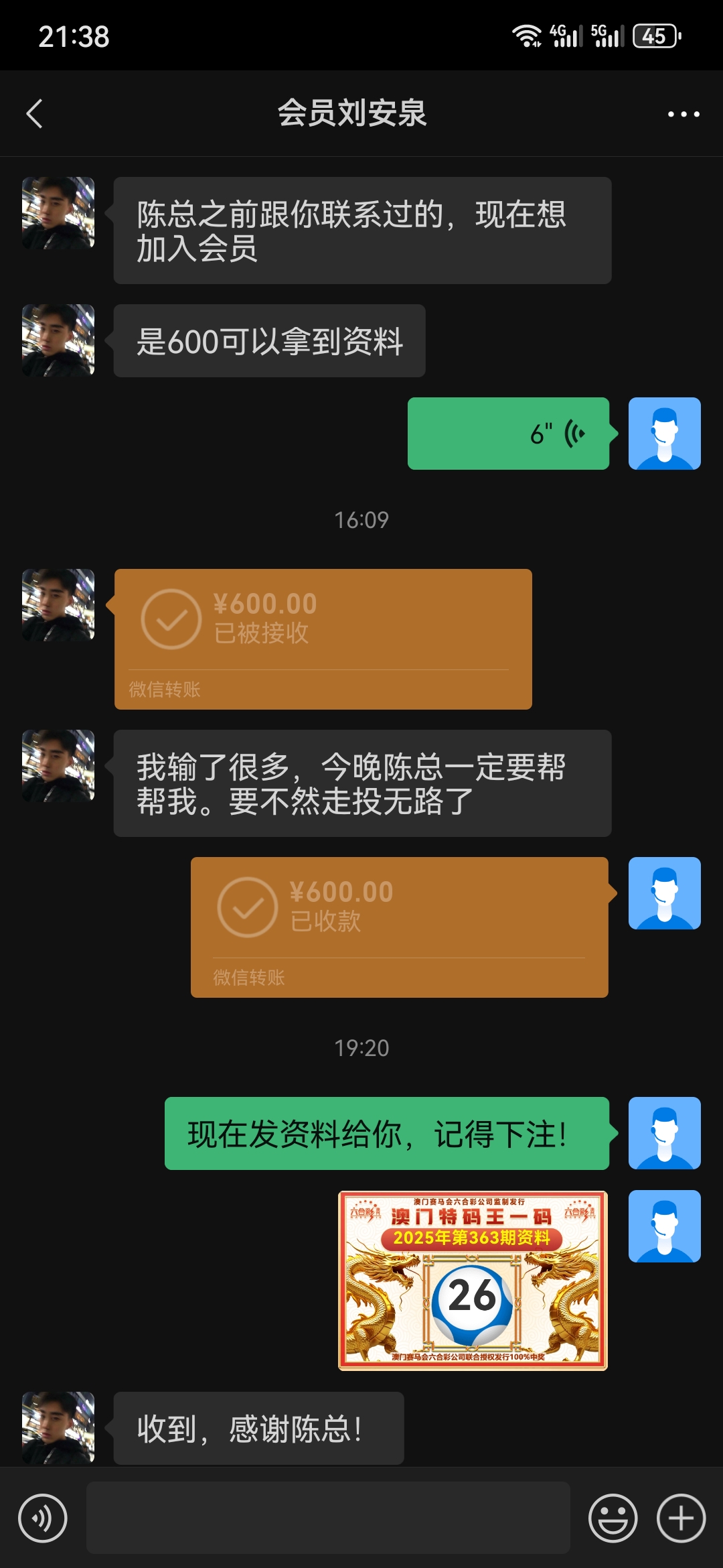 你好!我是湖南的彩民杨杰,没有一份稳定的资料下注我输的好惨,希望陈总能拉我一把,我很有诚意要加入会员合作的,我们这边有很多的地下黑庄下多少都有得赔的,所以说要博一博跟着陈总合作,要是资料准,我下大点,中了给大红包陈总喝茶。会员费发到陈总微信上了,请查收。早上起来记得帮我入会哦,我今天要开始下注了! |