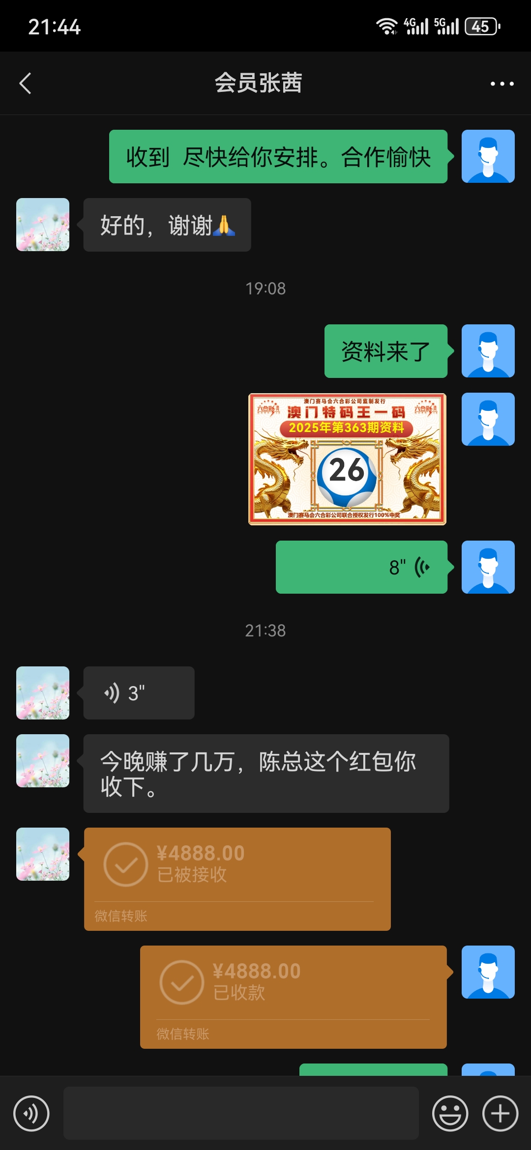 陈总好,今晚第一期合作不是太相信资料,下得比较小,给您包8888小红包吧,明天晚上继续跟您发财